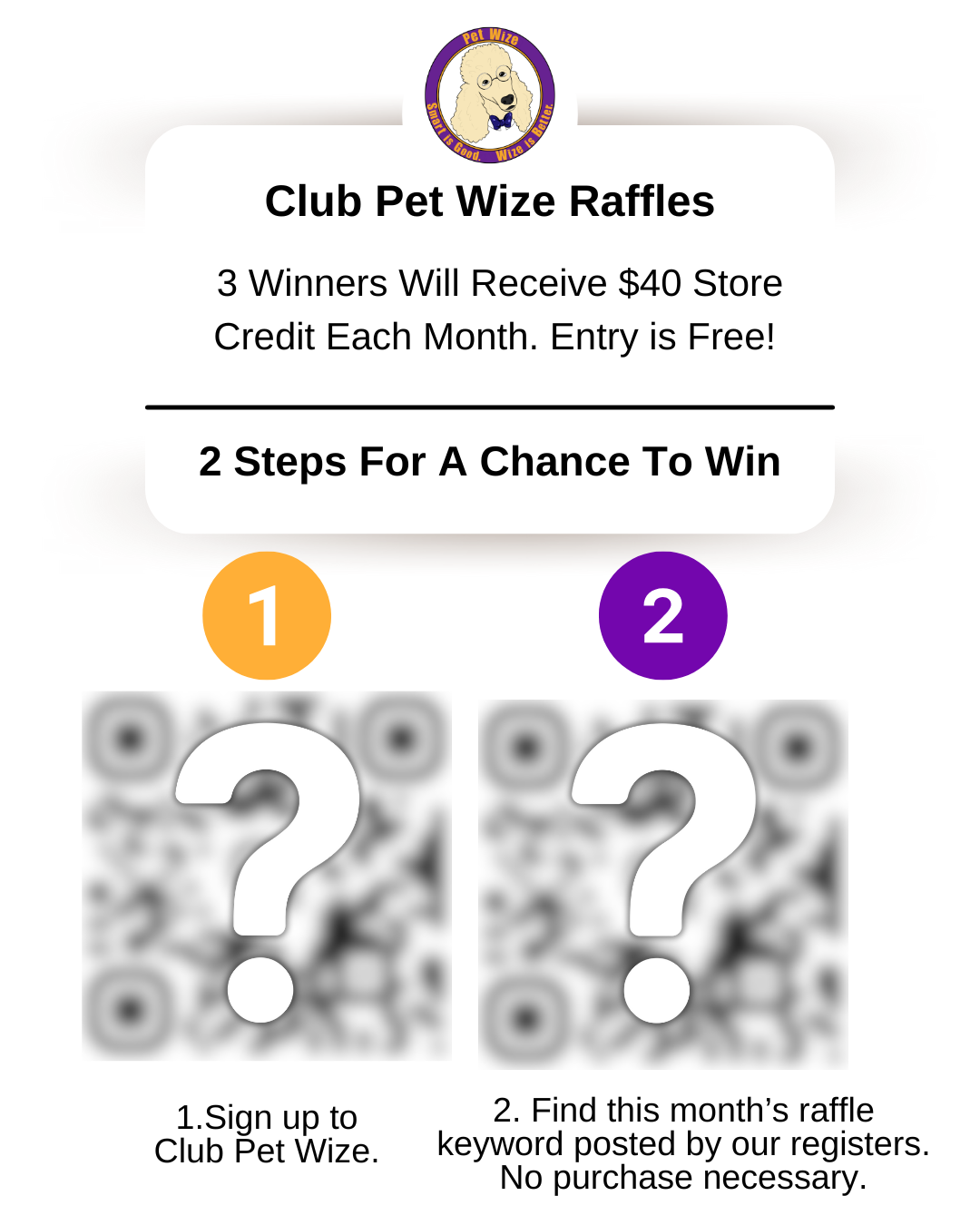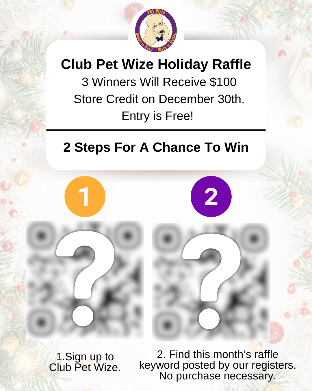 Club Pet Wize is our way of giving back to the people (and pets) who keep us going. Pet owners who shop at Pet Wize are automatically rewarded with excellent deals on premium pet food. But when you sign up to our text-based loyalty program Club Pet Wize, you enjoy additional perks such as free monthly raffle entries and pet contests that celebrate our pet loving community with freebies and store credit giveaways! Everyone that is properly signed up for raffles is eligible to win up to 2x a year! Please visit our store and ask our staff about how to get signed up.