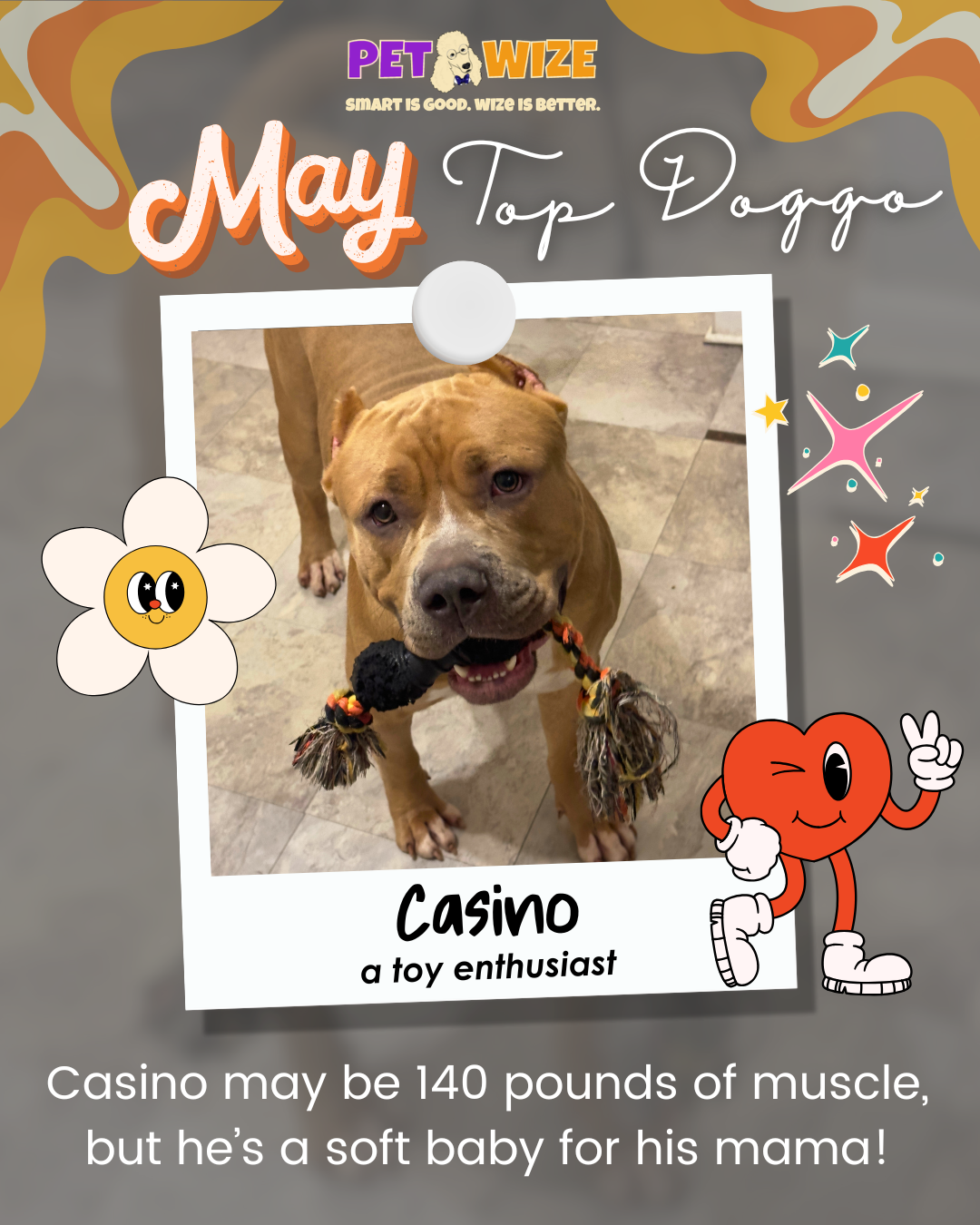 "Casino is honestly the biggest baby and even has a girlfriend a little smaller than him named Roulette. He loves to play with his toys but ABSOLUTELY LOVES his red ball as they are his favorite! He will stop playing with any toy until he sees it! Casino may be 140 pounds of muscle but he is a soft baby for his mama."