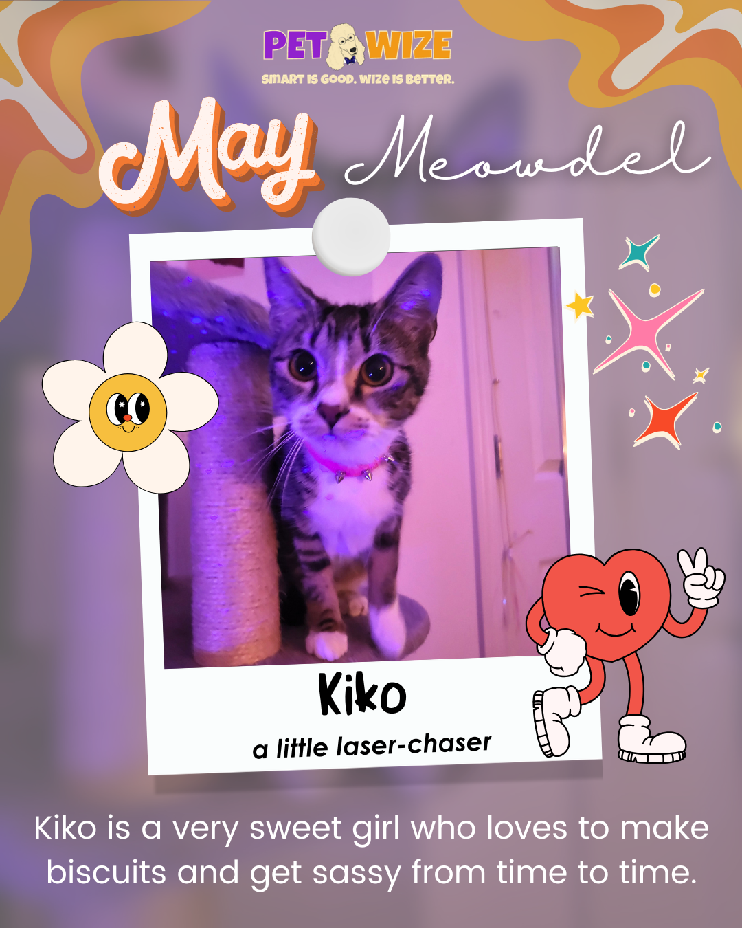"Kiko is a very sweet girl who loves to make biscuits and get sassy from time to time. Even though she’s fully grown, people mistake her for a baby because she’s so small. Her favorite toy is a laser pointer and she will even chase the light that reflects off of shiny things like jewelry!"