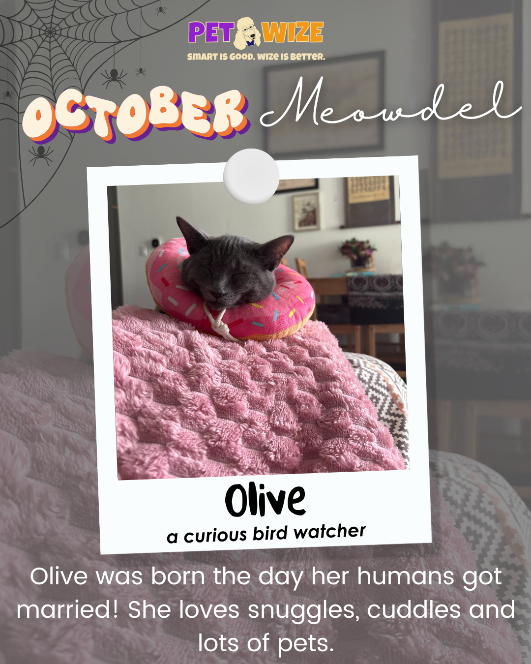 "Olive was born on our wedding day! She loves snuggles, cuddles and lots of pets. She goes nuts for tuna and Fussie Cat Goat Milk Gravy tubes. She also loves to watch movies with her parents! She is a very well-behaved kitty who loves watching the world go by perched on her hammock by the window."